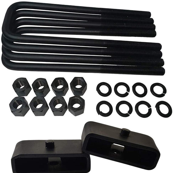 Our GMC Sierra Chevrolet Silverado 1500 2WD 4WD steel lift blocks and square u-bolts kit is the safest and most affordable way to lift and level your vehicle rear without compromising OEM ride quality and changing the overall suspension or steering geometry. This lift kit includes 2 carbon steel lift blocks and 4 premium-grade steel u-bolts with grade 8 hardware needed for installation. With this kit, you can raise the rear between 2 3, increasing ground clearance to clear bigger tires or improving rear-end sagging when hauling or towing heavy loads.
