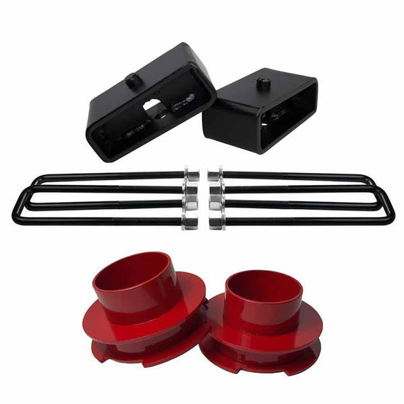 This lift kit contains 2 carbon steel spring spacers, 2 rear steel tapered lift block and 4 extended u-bolts with grade 8 hardware needed to install. Â All contents are made from high-quality US steel that has been tested for strength, durability, and road safety usage. You can customize this kit and choose your color preference and desired rear lift height. All parts are made and assembled in America by Road Fury. A lifetime replacement warranty is included with your purchase to assure quality and all products are free from defects.